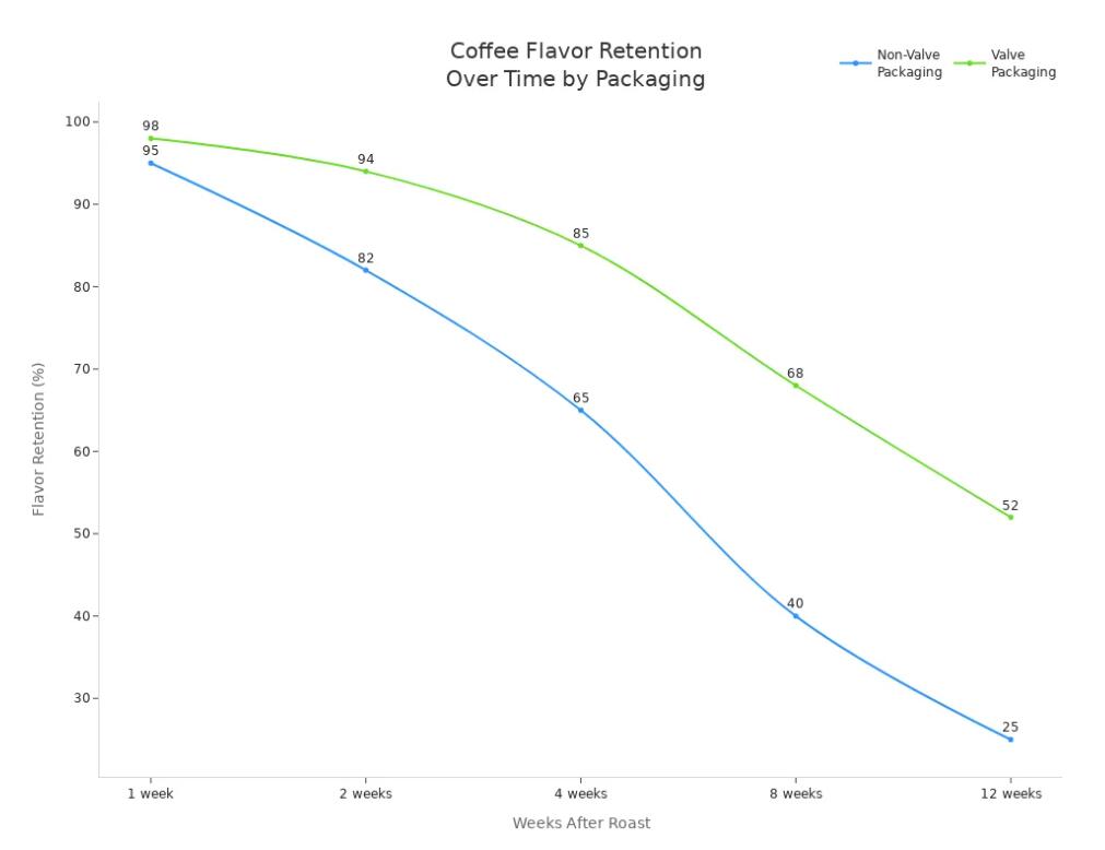 Packaging directly affects how long your coffee stays flavorful. Bags with degassing valves keep coffee fresher for longer. You can see the difference in flavor retention over time: